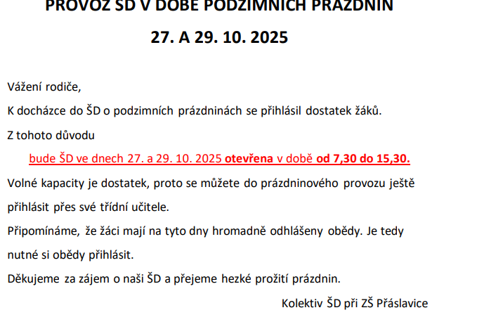 • Provoz ŠD o podzimních prázdninách